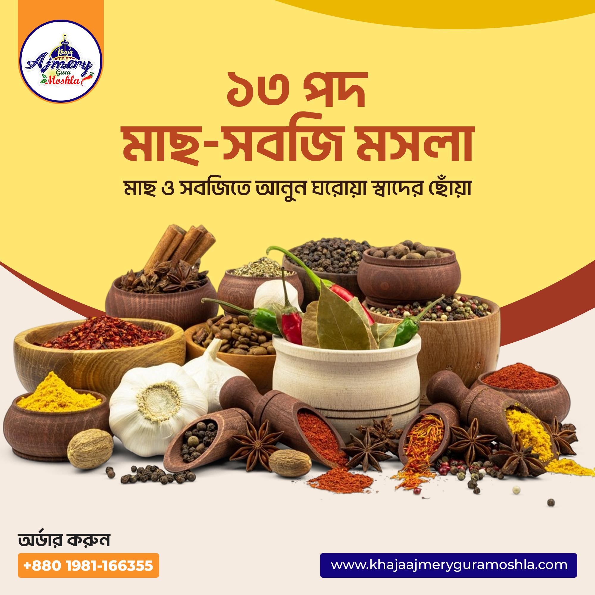 আমাদের স্পেশাল মাছ সবজির ম্যাজিক মসলার মিশ্রণে মাছ সবজি রান্নায় ঘ্রাণ ও স্বাদ অতুলনীয় করে তোলে। বিদেশী মসলার কোম্পানীগুলোর সাথে কম্পেয়ার করুন আমাদের মাছ সবজির ম্যাজিক মসলাটি ব্যবহার করে। চাষের মাছ রান্নায় আমাদের মসলাটি দারুন কারিশমা, স্বাদ ঘ্রাণ পাবেন। যা আপনি প্রসংসিত হবেন। ইনশাআল্লাহ